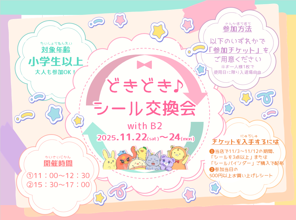 2025-11-01 / 最終更新日時 : 2025-11-01 bungukan-b2 イベント案内 どきどき♪シール交換会イベント シールブーム到来中! 11月22日(土)~24日(月・祝)に当店にてシール交換会を実施します! 詳しいルールなどは後日更新します♪ お楽しみに~ Follow me! FacebooktwitterHatenaPocket