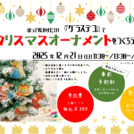 2025-12-06 / 最終更新日時 : 2025-12-06 bungukan-b2 イベント案内 グラスデコで「クリスマスオーナメント🎄」をつくろう! 開催日:2025年12月21日(日)11:30~/13:30~/15:30~ 参加費:1個につき税込300円 製作時間:1個につきおよそ15~30分 ※乾燥に時間がかかるためパックに入れてお持ち帰り &nb […]